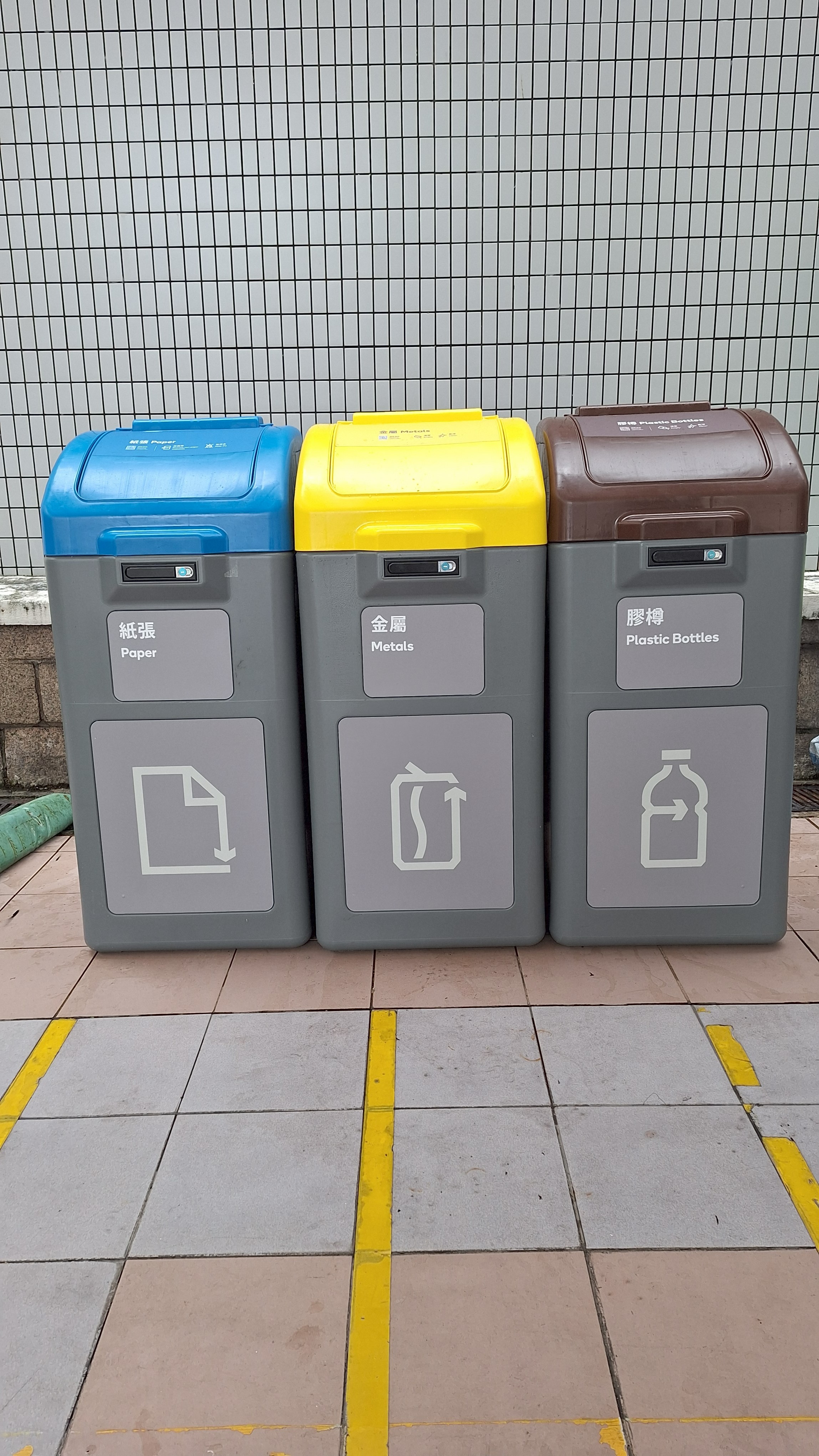 我們在有蓋操場上放置三色分類回收桶,讓學生把廢物分類回收,循序漸進再造。