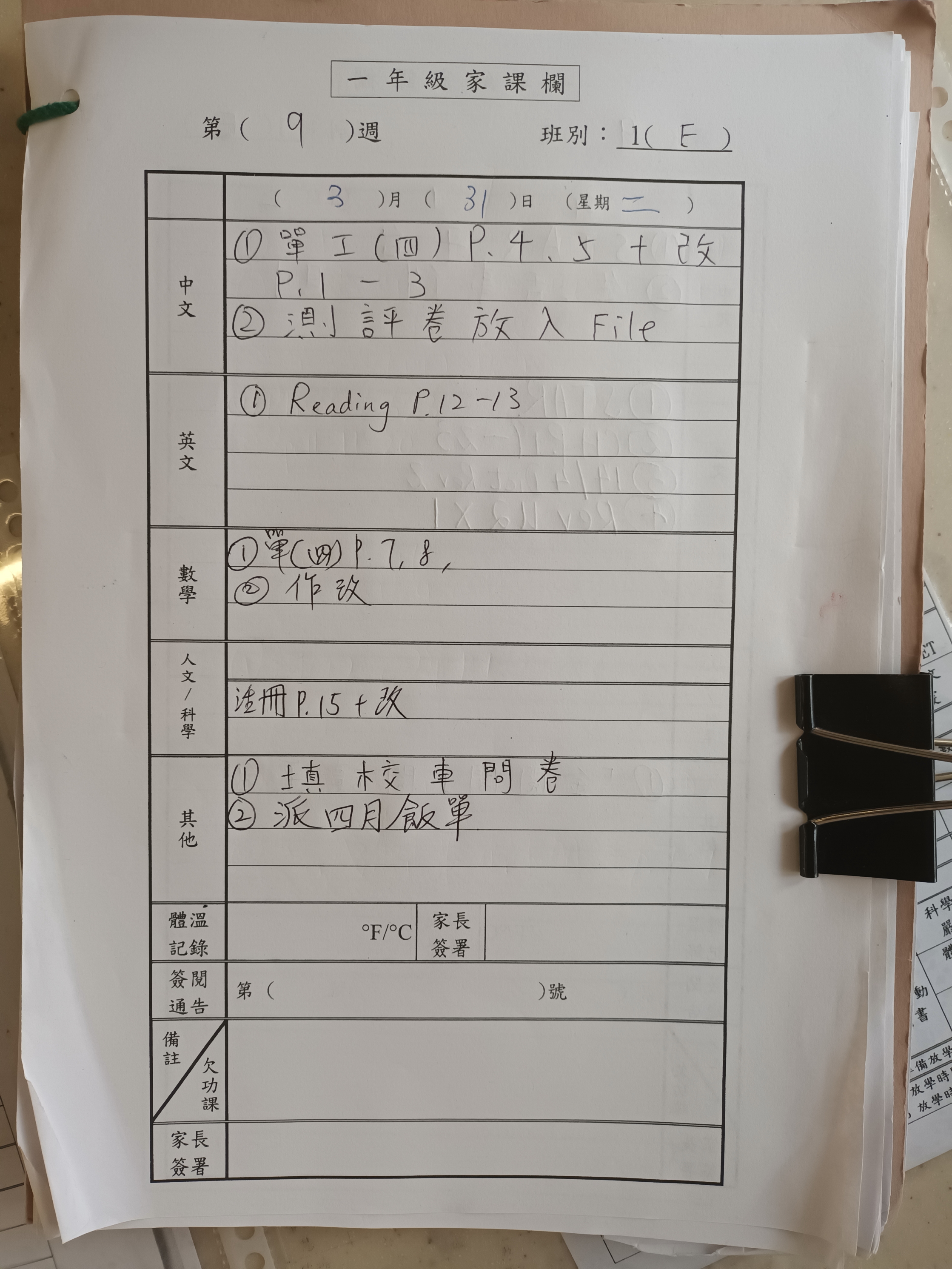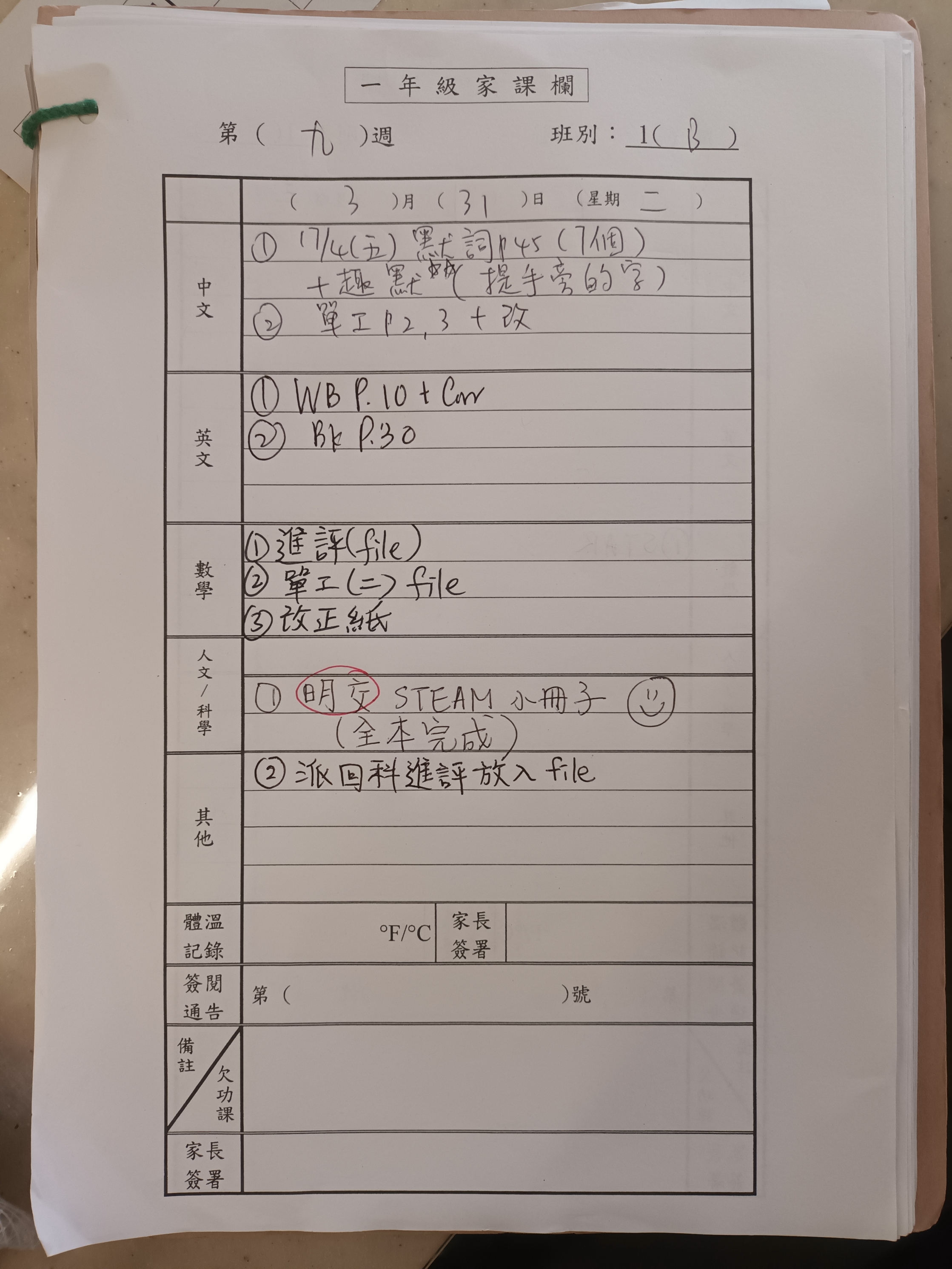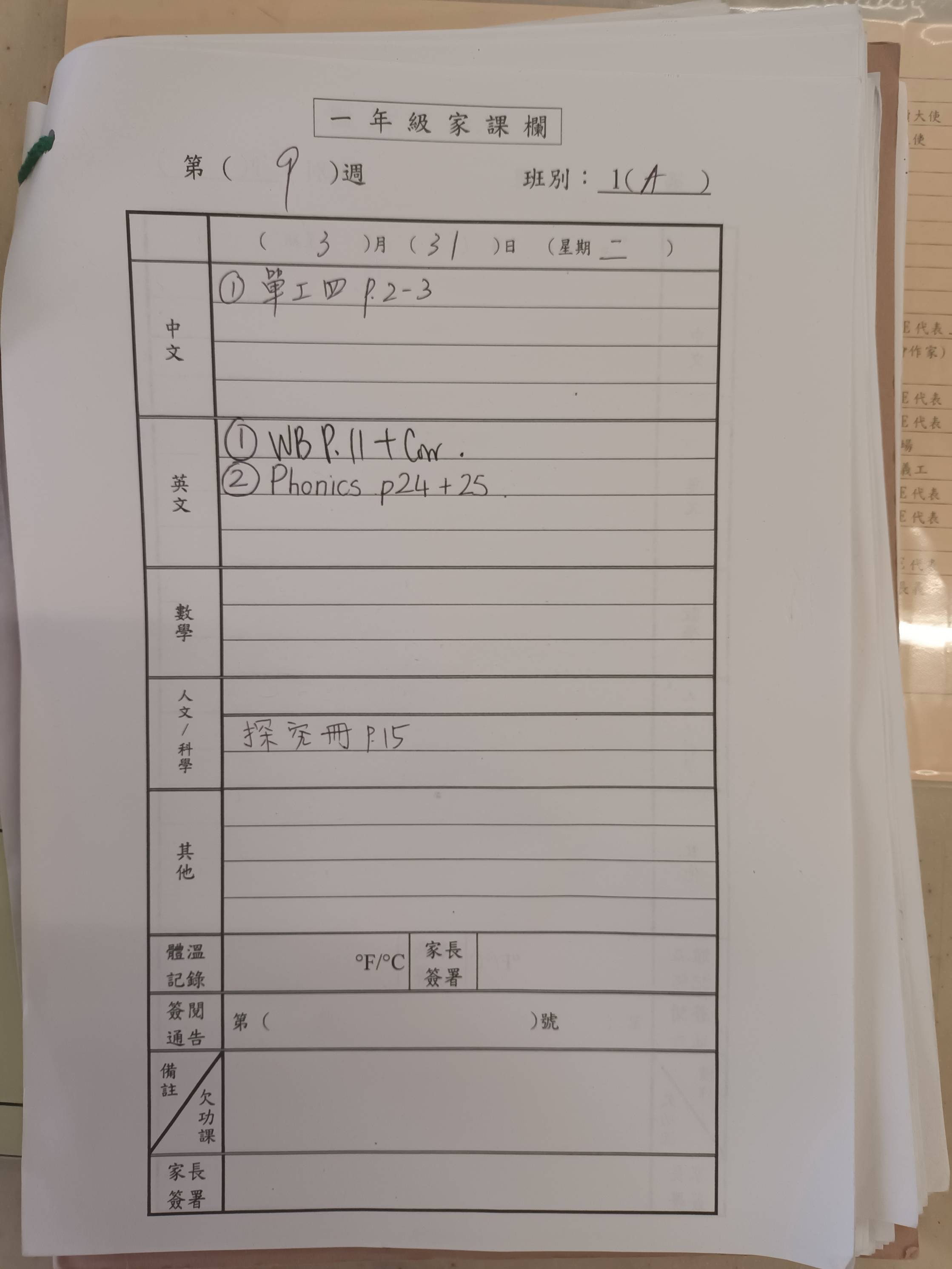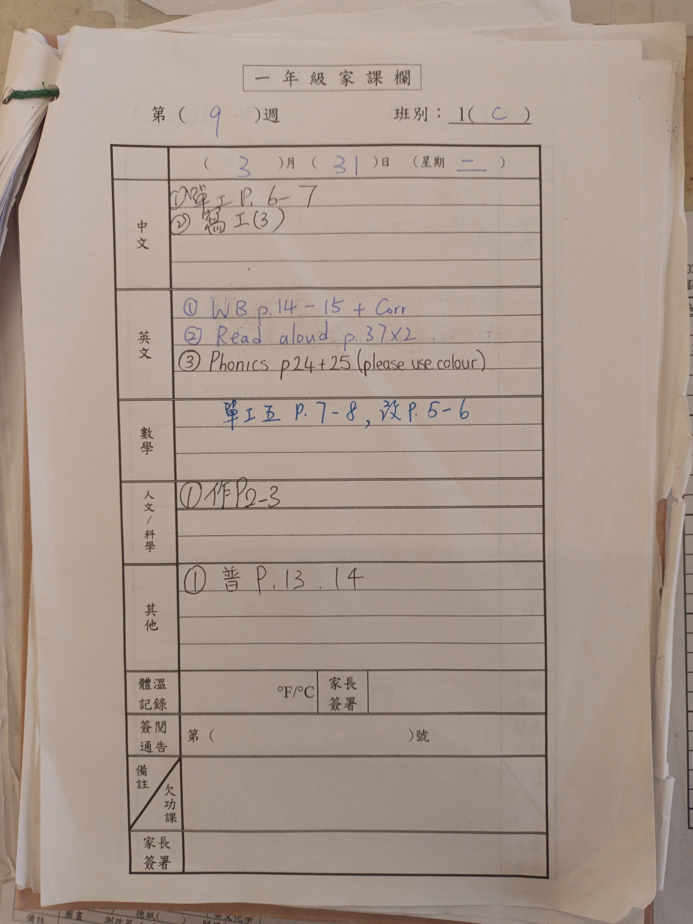 2025-2026年度 小一家課